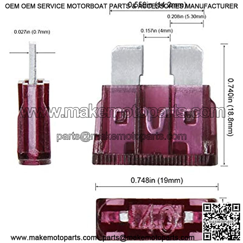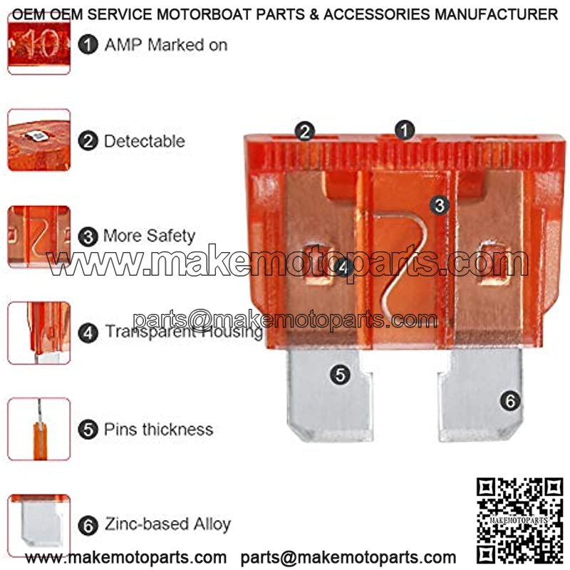 Type: Standard Box of 100 Standard Blade FusesMaterial: Zn Alloy and PlasticFuses Size: Approx. 19mm x 4.9mm x 19mmAmpere Rating: 5 AMP – 10pcs, 7.5 AMP – 10pcs, 10 AMP – 10pcs, 15 AMP – 10pcs, 20 AMP – 10pcs25 AMP – 10pcs, 30 AMP – 10pcs, 35 AMP – 10pcs, 40 AMP – 10pcs, 50 AMP – 10pcsSafe identification, easy to use