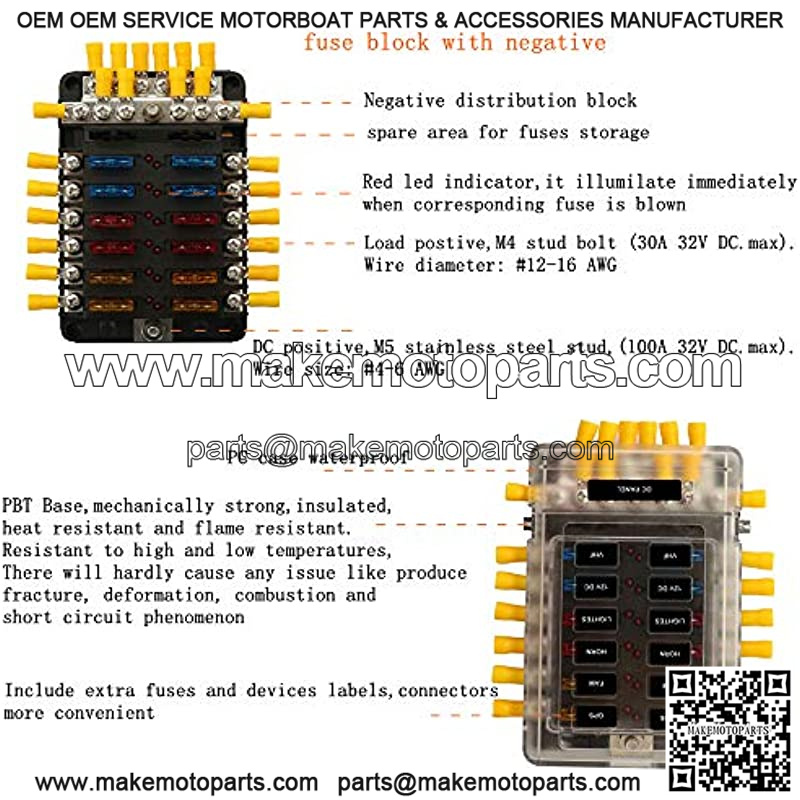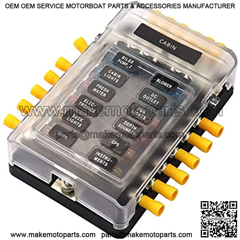 12 circuits power distribution fuse block with ground.2 spare fuses hole design,stock and replace fuse,more convenient,