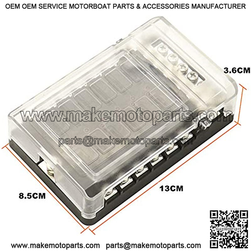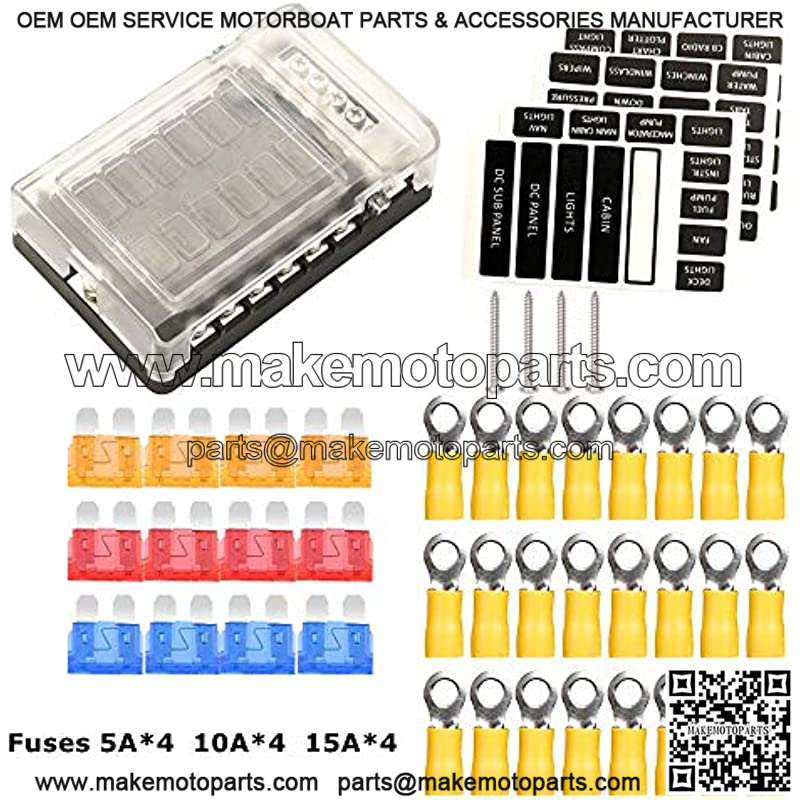 Including:1 x 12 circuits fuse block with cover,4 x 5A fuse,4 x 10A fuse,4 x 15A fuse,2 x sticker,4 x screws,24x connectors