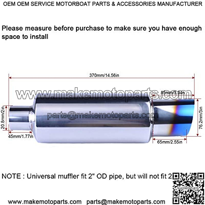 Dimension: 2 inch inlet, 3 inch outlet, Overall Length: 14.8 inch. NOTE : Universal muffler fit 2″ OD pipe, but Not fit 2″ ID pipe. Please measure the OD of your exhaust pipe before ordering.