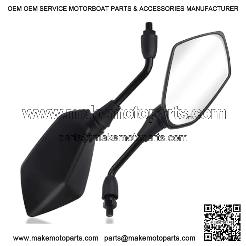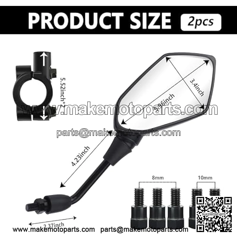 MOTORCYCLE MIRRORS ARE AN IMPORTANT AND INDISPENSIBLE PIECE OF RIDING EQUIPMENT THAT PROVIDE A SAFE AND CONVENIENT VIEW TO ENSURE SAFETY DURING THE RIDE!Motorcycle Mirrors Attributes??Colors: Black??Mirror size: 5.96??3.4 inch??Weight: 27.22 oz??Material: Glass / ABS plastic??Packaging:2?? Motorcycle mirrors5 bolts: 1?? 10MM positive thread screw1?? 10MM clockwise thread screw2?? 8MM clockwise thread screw1?? 8MM counterclockwise screw2?? Conversion adaptersMotorcycle Mirrors Functions??Feature: Scratch-resistant, durable and long-lasting??Function: For replacement of broken motorcycle mirrorsBefore each motorcycle side mirrors is shipped, we check and test it for you to make sure it is a perfect car tool accessory when you receive it! After purchase, if you have any suggestions or dissatisfaction, please submit them to us, we will actively listen to your feedback and improve it.