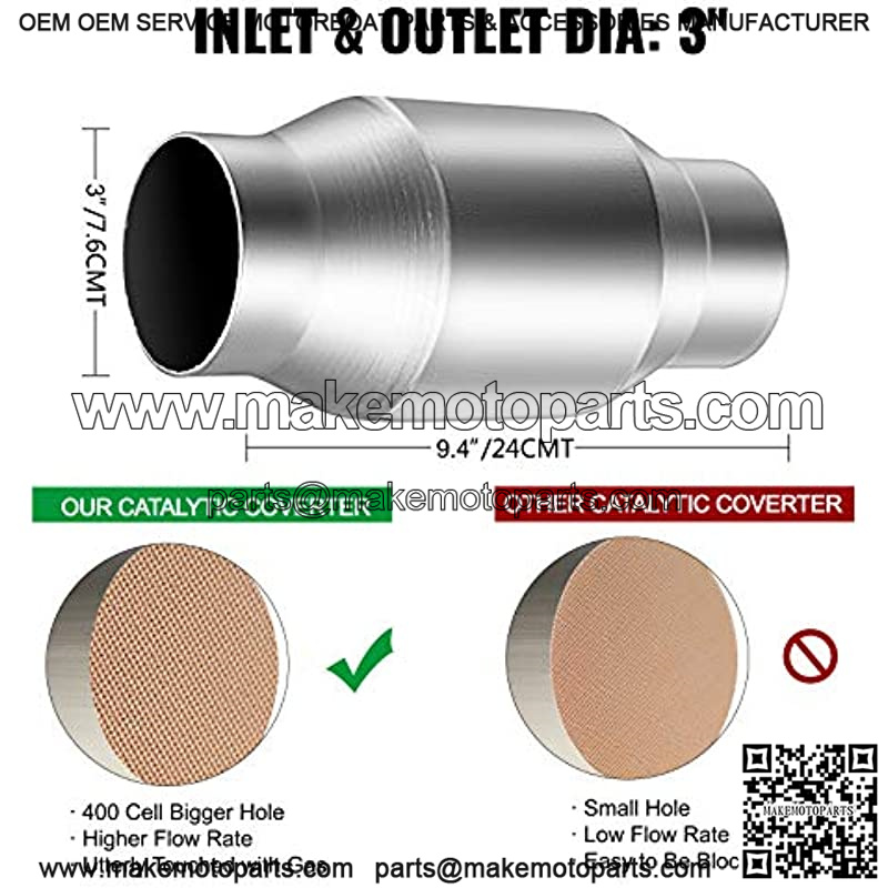 ??3″ INLET/ OUTLET DIAMETER??- Our catalytic converter has precise dimensions, with inlet and outlet dia. 3″, overall length: 9.4″, body width: 4.5″. Adopt liner ceramic with 400 cells, universal for gas vehicles with 3″ outer diameter exhaust pipe.