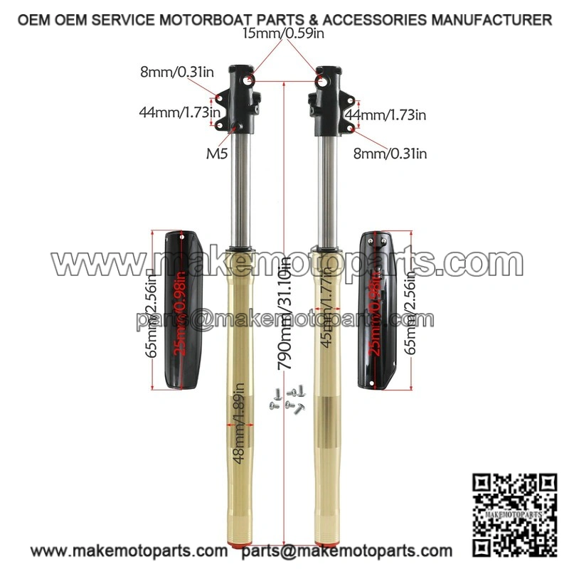Lower leg diameter: 48mm, Upper leg diameter: 45mm (Triple clamp inner diameter should be 1-1.5mm bigger than this figure)