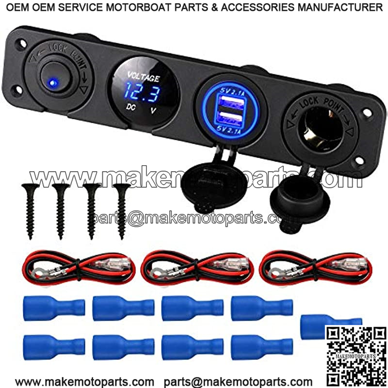 1 x 12V Cigarette Socket 1 x Light Digital Voltmeter 1 x Dual USB Power Outlet Socket 1 x ON-OFF Rocker Toggle Switch 1 x Four Holes Panel 4 x Stainless Steel Screws 9 x Blue Terminals