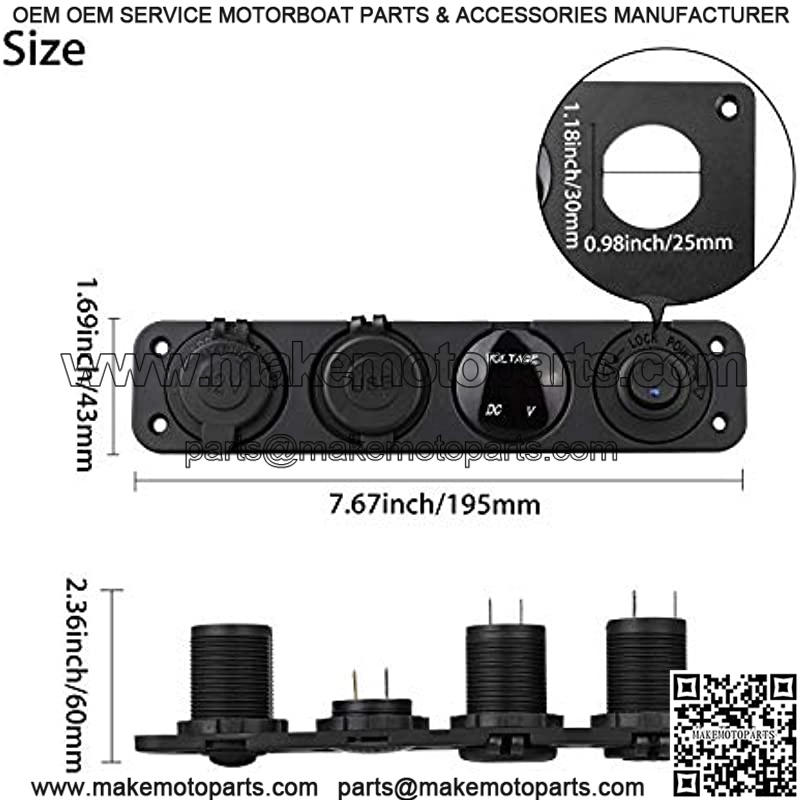 Cigarette Socket Dimension: Approx. 1.18″ *2.13″(30mm * 54mm) USB Car Socket Dimension: Approx. 1.18″ *2.05″(30mm * 52mm) Rocker Toggle Switch Dimension: Approx. 1.18″ *1.57″(30mm * 40mm) LED Voltmeter Dimension: Approx. 1.18″ *1.02″(30mm * 26mm) Four Holes Panel Dimension: Approx. 7.67″ * 1.69″(L * W)