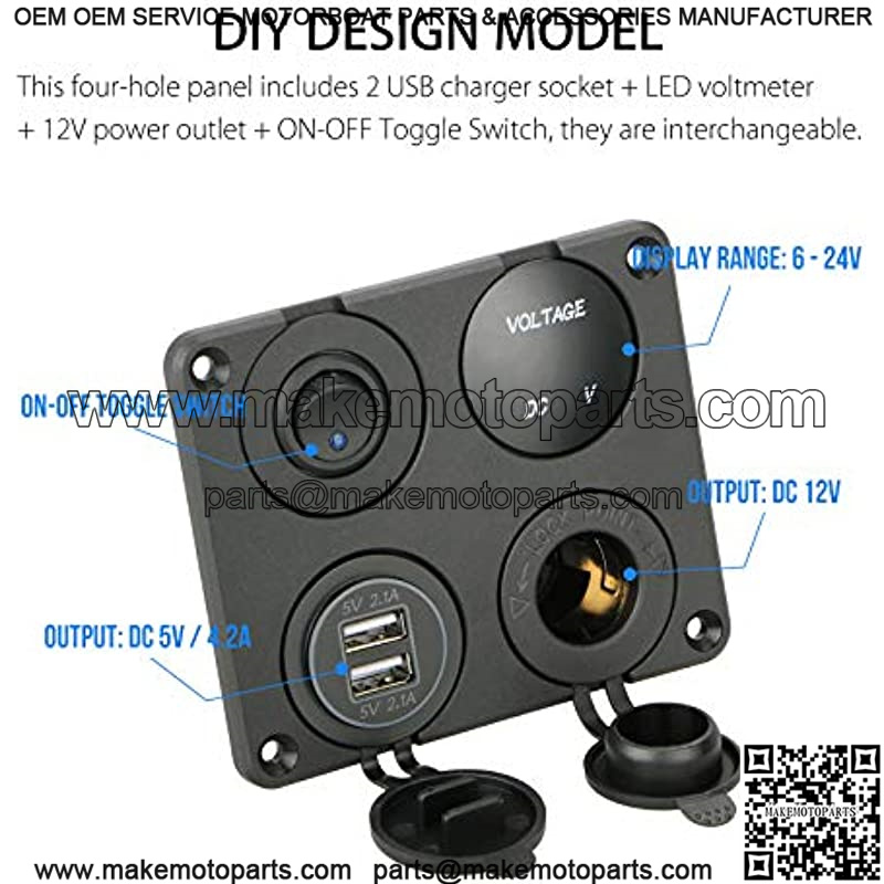 4 IN 1 DESIGN: This four-hole panel includes 2 USB charger socket (Output: DC 5V/4.2A) + LED voltmeter (Display range: 6-24V) + 12V power outlet (Output: DC 12V) + ON-OFF Toggle Switch, they are interchangeable. You also can replace any port with additional USB outlets, or anything else that fits