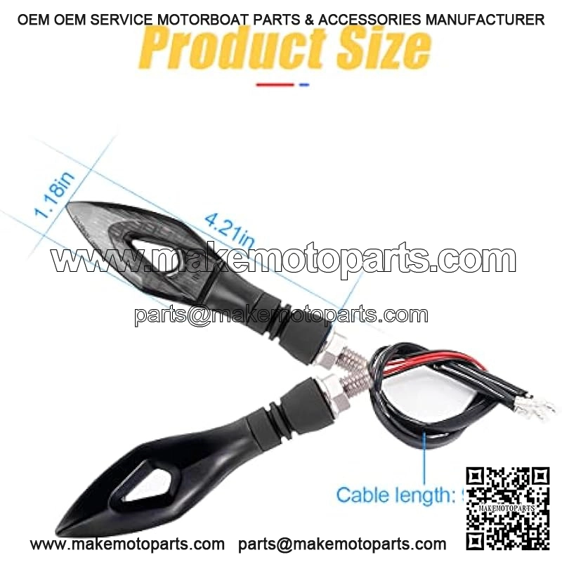 Specification:- Lights Color: Amber Yellow- Material: ABS Plastic, Acrylic, Rubber- LED Lights Number: 14 bulbs- Voltage: DC 12V- Size: 4.13×0.79×1.18In, bolt 0.79In- Usage Life: 30000H- Package Included: 4 x Turn Signal IndicatorFeatures:- Water Flowing Motorcycle 14 LED Turn Signal Indicator Lights- Super bright and cool shape design, giving your motorcycle an extra glow- Universal Fits All 12V Motorbikes.- 3 In 1, with turn signal & daytime running &f Brake Light. Easy install, durable, unique design, very bright.- Long-lasting, low power consumption,energy-saving.- Super bright LED provide maximum visibility and safety.- The best choice for your old Motorcycle Turn Signals.