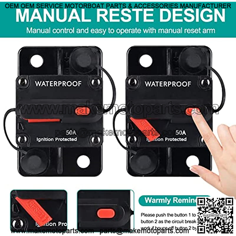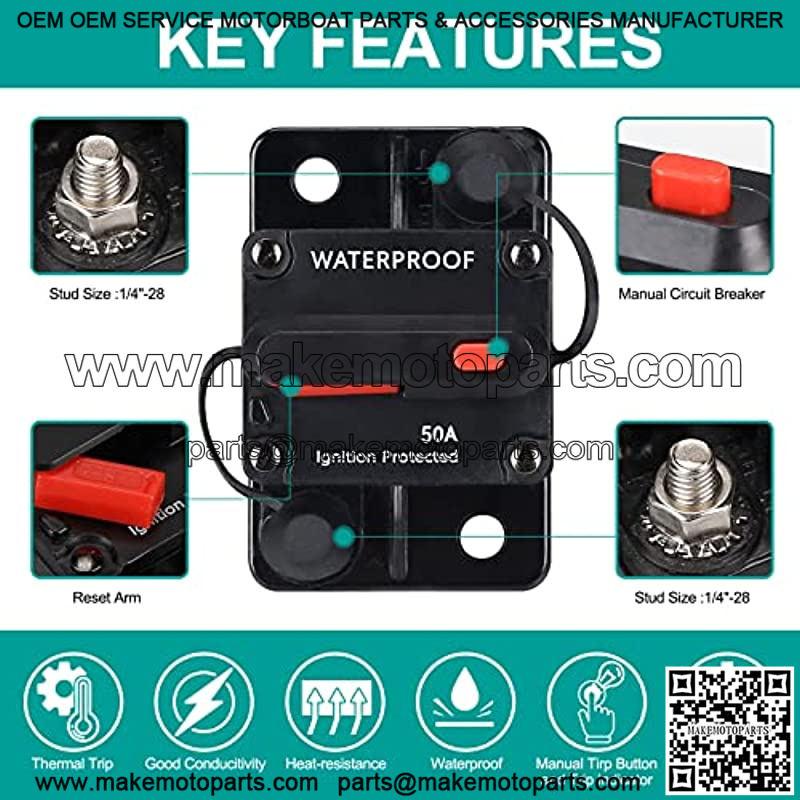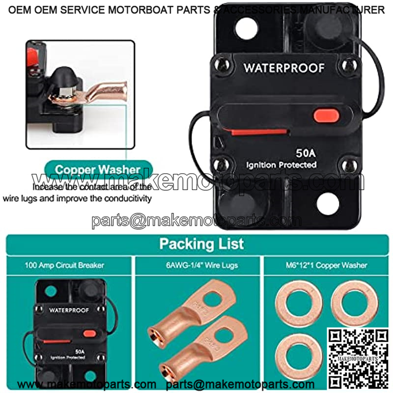 Warmly Reminder:1. Please choose the right current circuit breaker base on your requirements.2.Please assure the products work on right working temperature to avoid too heat then stop work..Features:No need to keep replacing fuses anymore, simply reset breaker and you are ready to go.Easy to operate with manual reset arm.good conductivity, high temperature resistance.Splash and dust proof Water proofUnique Push Button Reset can also be used as a Kill SwitchSpecification:1. (LxWxH) 74 x 49 x 44 mm /2.9 x 1.9 x1.7 inch2. Net weight: 0.2 LB3. Voltage: 12-48V DC4.Rated current: 30/40/50/60/70/80/100/120/150/200/250/300 Amp5.Storage Temperature: -34 ??C to 149 ??C (-30??F to 300??F )6. Operating temp: -32??C to 82??C (-25??F to 180??F).7. Material: Plastic and MetalPackage included: 1x 50A Waterproof Circuit Breaker2 x 6AWG-1/4” Wire Lugs4 x M6 Copper Washers