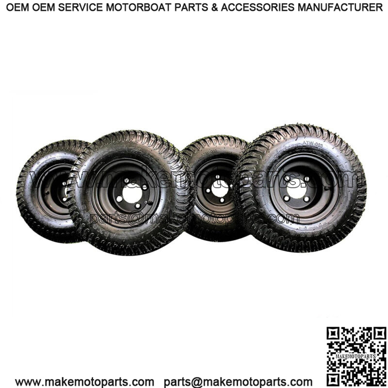 Set of 4 Tire and Wheel Assemblies *** Wheel Color: Matte Black *** Wheel Size: 8×7 *** Pilot Hole: 2.83″ *** Number of Bolt Holes: 4 *** Bolt Hole Size: .590″ *** Bolt Circle: 4″ *** Offset: Centered *** Tire Size: 18×8.50-8 *** 4 Ply *** Tread Code: ATW-003 *** Non-Directional *** Tire OD: 17.7 Nom *** Tire SW: 8.3 Nom *** PSI: 22 *** Load Rating at 10 mph: 815 lbs..