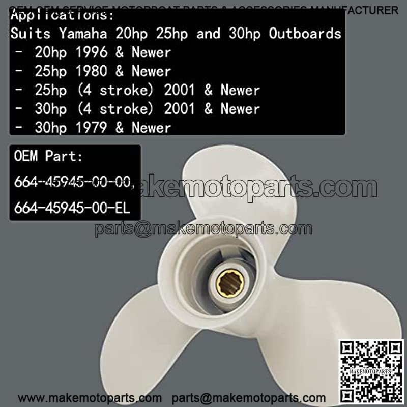 FEATURES:Size: 9 7/8x10Number of Blade: 3Number of Spline: 10Rotation: Right-HandMaterial: High Quality AluminumPACKAGE??1 x Propeller for YAMAHA OutboardReplacement:This quality aftermarket propeller can replace Yamaha OEM Part: 664-45945-00-00, 664-45945-00-ELApplications:
