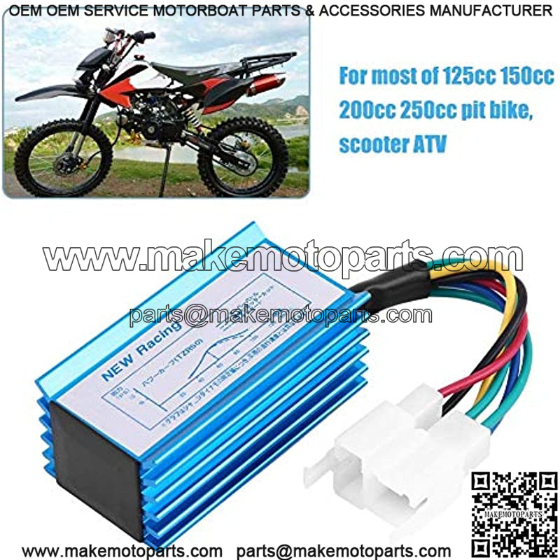 6 pin CDI for most of 125cc 150cc 200cc 250cc pit bike, scooter ATV. Increase Ignition energy intensity for easy starting and smooth riding. Eliminate rev-limit which keeps your bike restricted, and also reset your ignition advance curve for better acceleration. This unit will give you 5-10 miles speed boost on your bike. Easy installation, just plug it on.