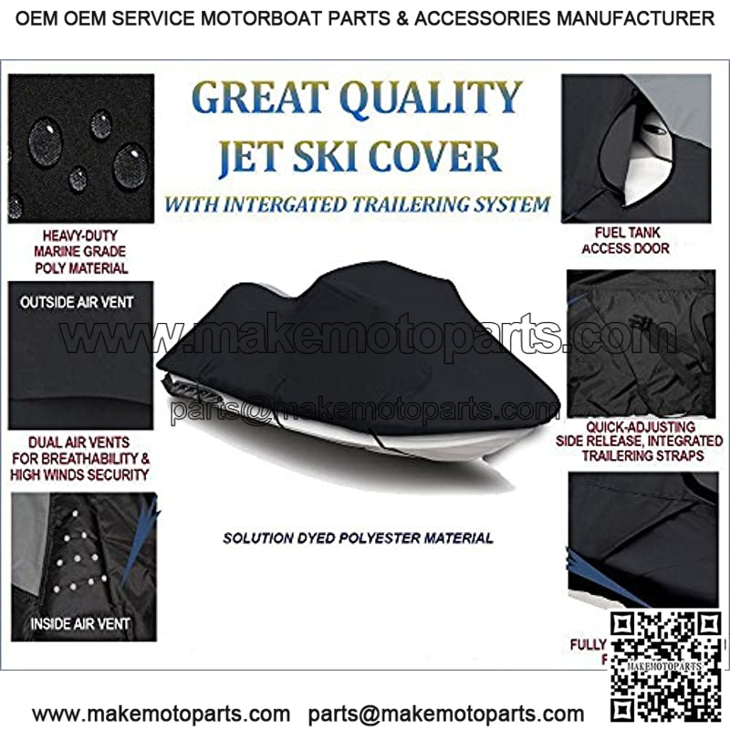 Keep your PWC covered and protected! Our super quality travel & storage Jet Skwill protect your jetski all year round. Color: Black; Sleek all black design. Made from 600 Denier Technologically advanced Heavy-Duty Marine Grade Poly Material with a water resistant urethane coating.- Superior Indoor and Outdoor protection for your PWC! All-weather personal watercraft Covers are designed for: Storage, Mooring and Trailering purposes. Easy installation; Heavy-duty, fully elastic shock cord installed in the hem of jetski cover; Trailer Hitch Front Opening for Trailer Pin; Integrated trailering system with built-in quick adjusting detachable straps for tension panels; Tension panels tightly secure cover during highway travel. Air vents in the rear of the cover are dual-purpose to prevent moisture and wind lofting. Package includes the following gear: 1- Brand New, Personal Water Craft Cover. FREE Additional Parts / Accessories: Storage Bag; Tie-Down Straps. Multi-Purpose: Tarpaulin is designed with All Storage Options in Mind: Ideal for indoors, can be used outdoors mooring on the water, on a lift, at the dock, sunshade at the Boat Marina. This cover offers superior resistance to fading, tearing. A great, economical choice versus OEM fitted cover options. Winterizing Your Jet Ski Our Cover can be a strong and durable alternative to shrink wrap during winter weather storage. Semi-custom fit Jetski Covers will accommodate most Personal Watercrafts in the industry. 2 Year Warranty.