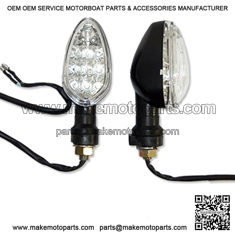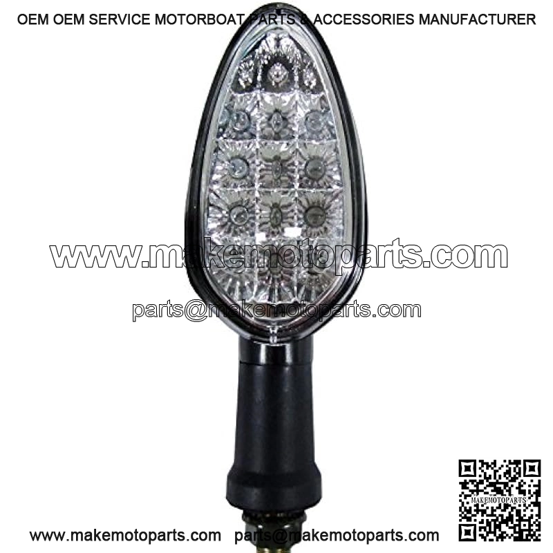 Each Turn signal features 12 bright LED’s with a clear lens construction. Turn signals use LED’s instead of regular bulbs which lasts 8 times longer, provides more lighting, and uses less energy than regular bulbs. When lit, LED’s provide an amber color. Heavy duty, rubber mounting base with threaded mounting shaft. (In some rare cases, certain bikes may require a different flasher or load equalizer due to leds using less amperage that standard bulbs).