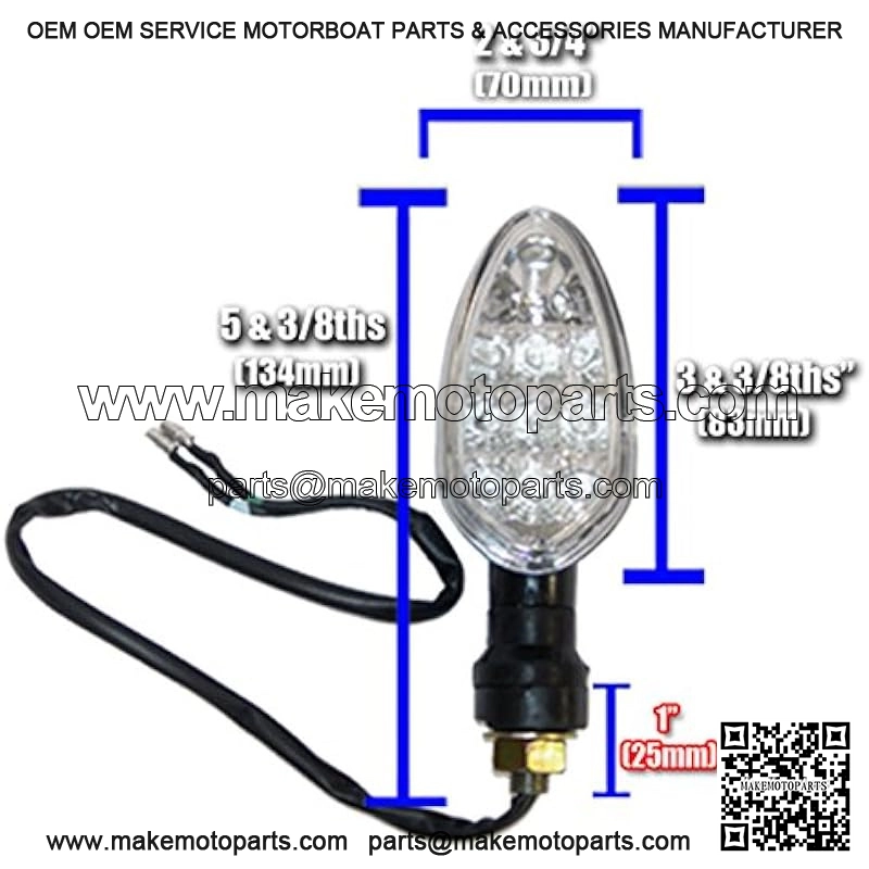 Dimensions: Overall length (without shaft): 4 & 3/8ths” (112mm), Diameter of shaft: 0.25″ (6mm), Length of mounting shaft: 1″ (25mm), Turn signals have two color coded wires, so they will work either as turn signals or as running lights.