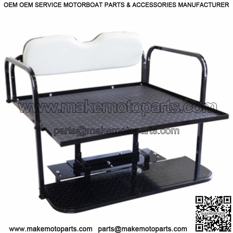 Overview: This seat kit makes a great addition to any golf cart converting your 2 passenger golf cart in to a 4 passenger golf cart. This seat kit includes the Flip Folding capability which allows the bottom seat cushion to flip over and converts the 4 passenger golf cart in to a very strong utility cargo bed featuring our HD Poly Deck for ultimate strength and versatility measuring 42W X 32D. We also include a grab strap to assist when flipping the seat from the closed 4 passenger design over to the cargo bed design. Seat Cushions: All seat cushions are marine grade and are factory matched colors. The back of the seat cushions have a polypropylene backing with pre tapped bolt holes for the seat cushions to mount to. Also with the NO Rot, NO Wood design and the use of polypropylene seat backing you no longer have rotting wood on the backs of the seat in a few years. Installation Details: This items will require 1.5 to 2 hours to complete the installation, however we do include very nice FULL COLOR installation instructions that are clearly labeled. All mounting hardware, bolts, and supports are included, this will make for an easier stress free installation – With this seat kit you will remove your factory basket behind the seat along with all of the brackets that connect the seat to the golf cart. This kit will replace the removed brackets and this kit will include new rear roof supports. – Technical support is always available by phone or email ready to answer any questions. – Estimated Installation Time is 1.5 to 2 Hours