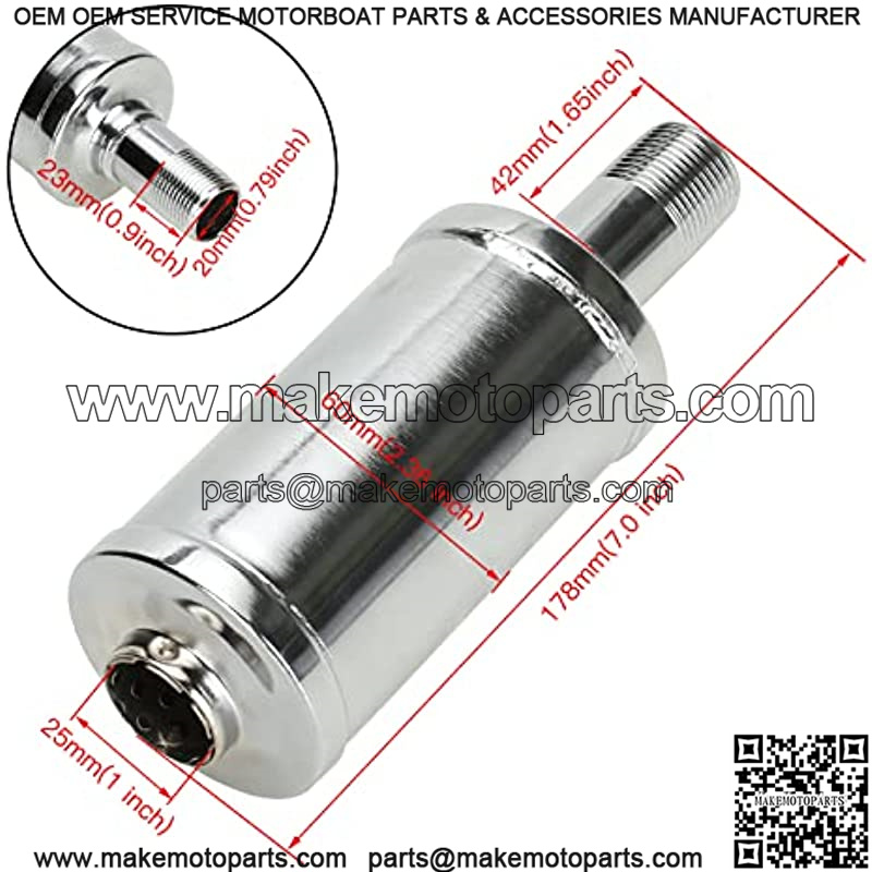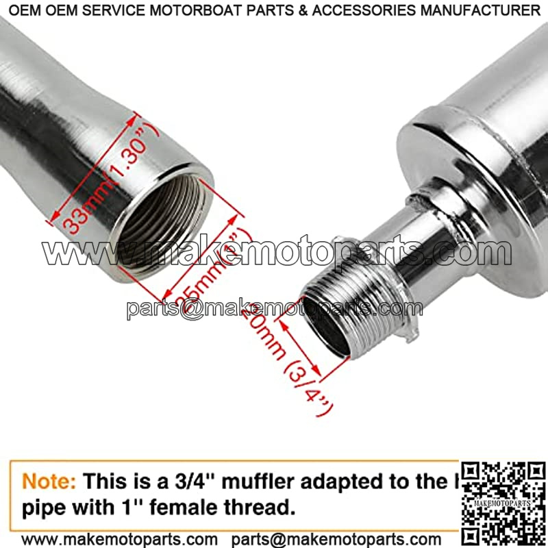 Product Name: 3/4???? universal muffler Material: Metal Color: Silver Size Overall length: 178mm(7.0 inch) Inner diameter of pipe: 20mm(3/4 inch) Outside diameter of pipe: 25mm(1 inch) Thread length: 23mm(0.9 inch)