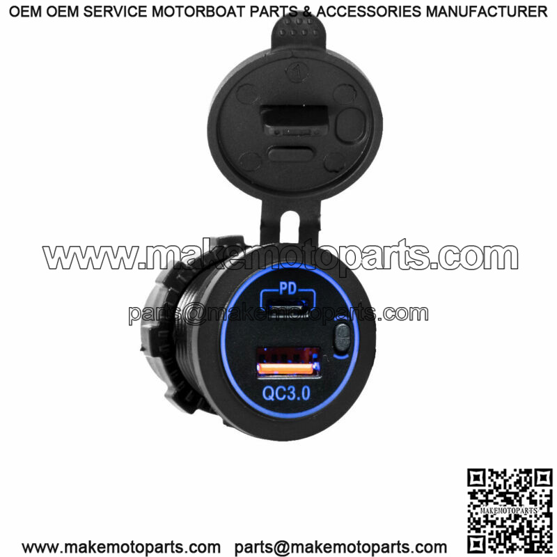 Charge a variety of devices up to 20 times faster when compared to a standard charger. The USB/USB-C Dual Fast Charger operates from 12 to 24 volts, includes backlit LED for increased visibility, and on/off button for customers who choose not to have the USB wired to the key switch. Charger comes with a rubber face cover, ring nut for mounting, and two wire connectors for easy installation.