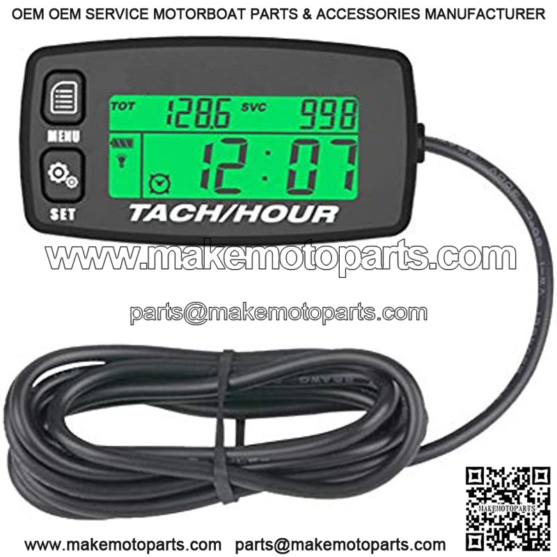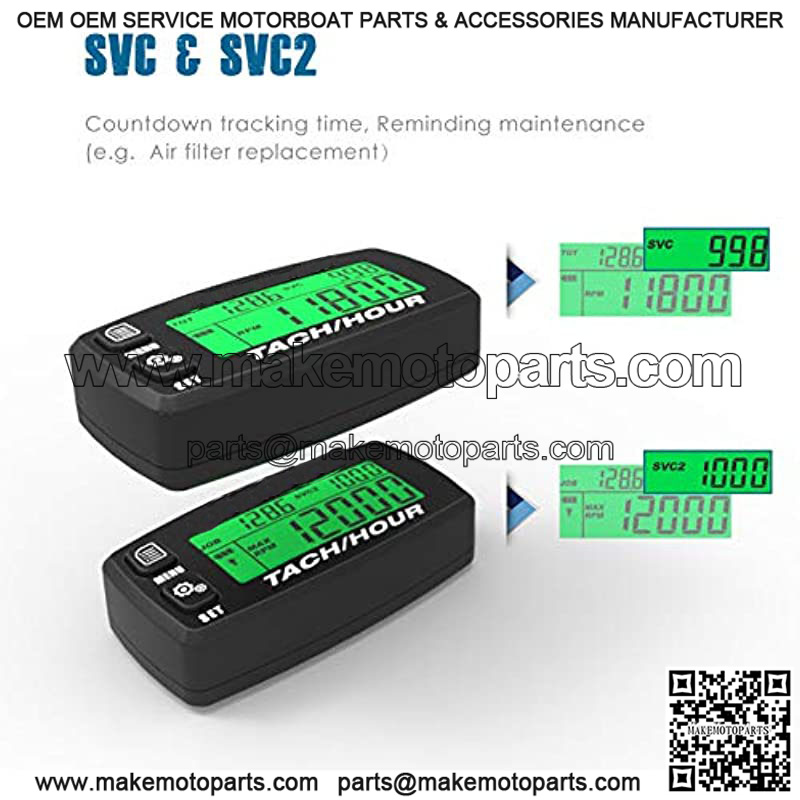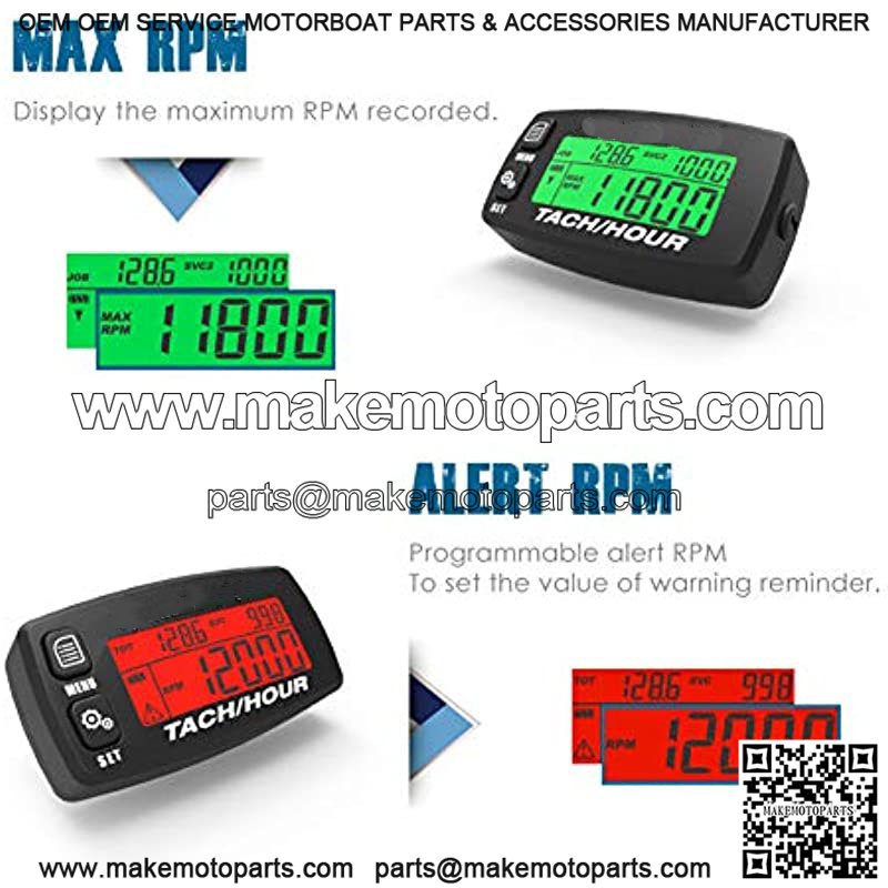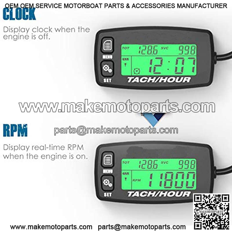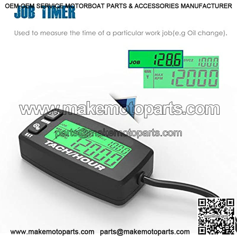 Inductive Tachometer Track Oil Change Hour Meter Backlit Digital Tach Hour Meter for 2 or 4 stroke gasoline engine maintenance, maintenance timing and RPM detection, backlits mode selection,Shutdown function ,easy to install and operate.24-hour clock display..Large buttons can be easily operated while wearing gloves,large font accurately reading RPM and time. The maintenance time setting reminds you to pay attention to the engine status at regular intervals, so that you can repair and replace the engine oil and air filter to protect it and extend its service life. Induction line length??47??In??(It can be extended, the signal is stable in 390(In). It can be cut short and does not affect signal reception, but you need to do it yourself) The engine stops showing the total working time TOT 0.0 and displays the current RPM while working. 2 service timer (SVC & SVC2) functionsCountdown to track time, remind maintenance, such as replacing air filterProgrammable maintenance interval is 0-250 hours Job timer (JOB) functionUsed to measure the time for a specific job, such as oil changeJOB timer reading display range is 0 to 99,999 hours, accuracy is 0.1 hours, can be reset Tachometer functionThe display range of the tachometer is 0-25,000 RPM, the resolution is 10 RPM, and the refresh rate is 0.5S / 1S.Record and call the engine MAX RPM, this value can be reset.Programmable RPM alarm, red backlit display and flashing warning icon remind the engine speed is out of range. Remind you to be crazy. Programmable backlight mode: auto / off / on.