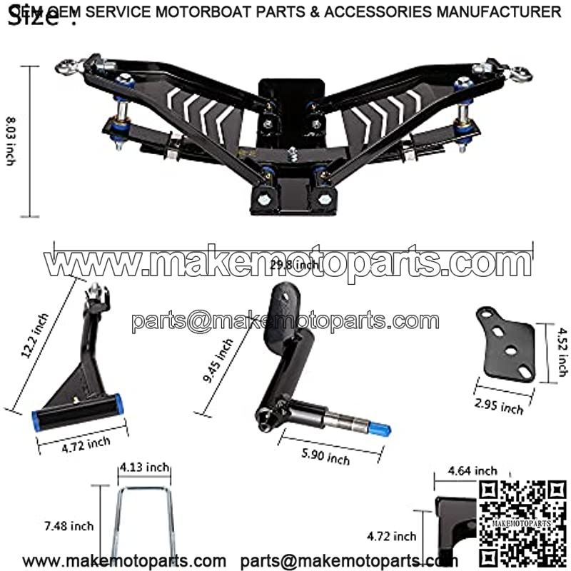 Kit includes: 1 x main suspension assembly, 2 x spindles, 2 x a-arms, 2 x rear lift blocks, 2 x rear shock mounting plates, 2 x rear spring u-bolts