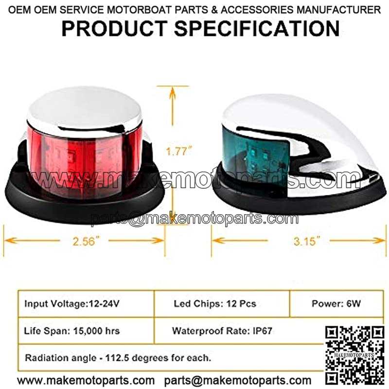 Avoiding accident, is main meaning of boat navigation light.Selecting industry leading LED technology can create 3NM visual range thatmeets USCG requirement, which provides excellent signal to boat driver thatunder dark environment to avoid accident.Marine grade IP67 waterproof rate design insulates moisturethreat and gives all-around protection to build-in LED lamps also enhances ts working time. Also, updated marine grade cable protects build-inconnection wire better. Copper plated zinc surface cover enhanceanti-corruption ability and UV performance that you can never image how durableabout this boat navigation light.As boat navigation light industry leader, we always insist ourmission and guide you home through our boat light.Package includes:2 X LED Navigation Lights (1 Green+ 1 Red)1 X Manual Guide