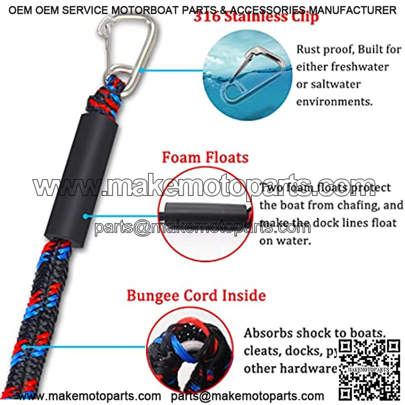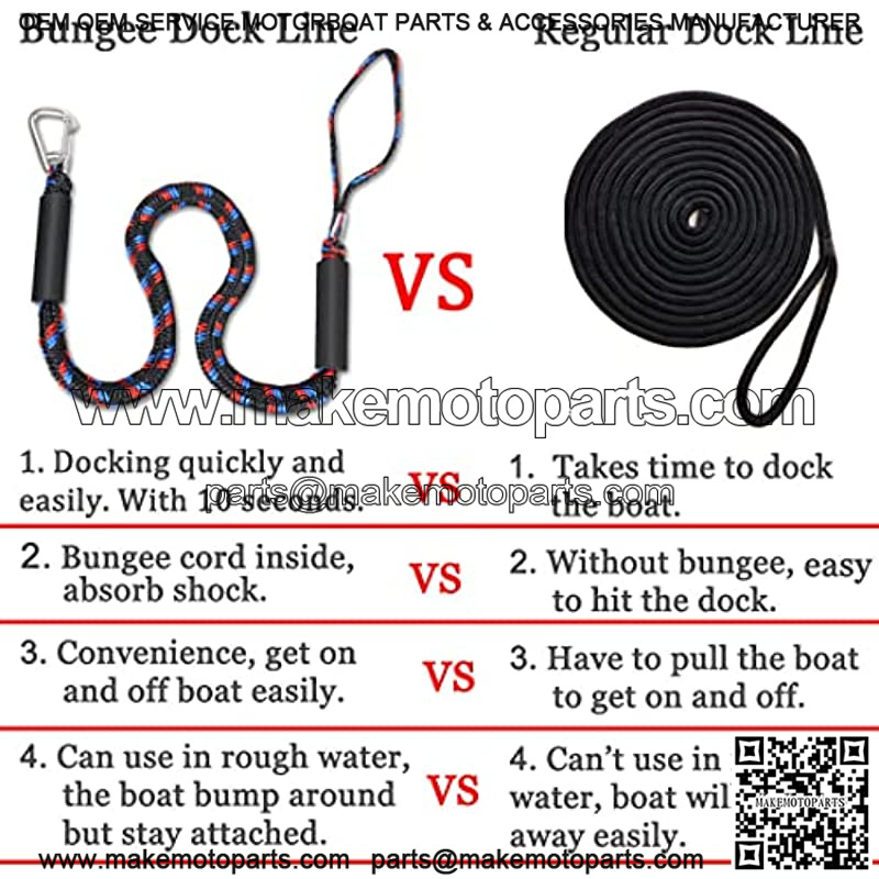 ??MORE SECURE TO DOCK??Our bungee dock lines can absorb shock to boats, cleats, docks, pylons and other hardware. Boats will easy run away or beat up against the dock when use the regular rope, because waves would bump them around until the rope came loose. But our our bungee dock lines have a lot of elastic and can bump around but stay attached. They stretch enough to keep from breaking loose but not enough to hit the dock.