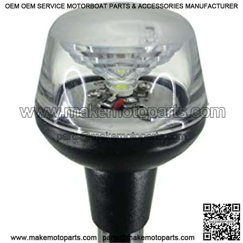 This light is made of ABS & PC. For all 8-30VDC electrical systems. Plug-in base to be purchased separately for installation. Housing is non-corrosive, non-magnetic, and impact and shock-resistant. Pole length: 24″; Plug-in base required to secure the pole in place; 360 degrees visibility; Wattage: 1.3W. Beam Angle: 120 degree; Working Voltage: DC8-30V; LED Color: Daylight White; Surface Mount; Waterproofing Standard: IP:65; Lumen: 93 Lumen. LED: 1pc; Pole Diameter: 3/4″. Certified for use on sail or power driven vessel under 12 meters (39.4′) in length. Meets USCG requirement for 2NM visibility. Approvals: IMO COLREG 72, USCG, ABYC A-16, NMMA type Accepted Item: P01126LLD7.