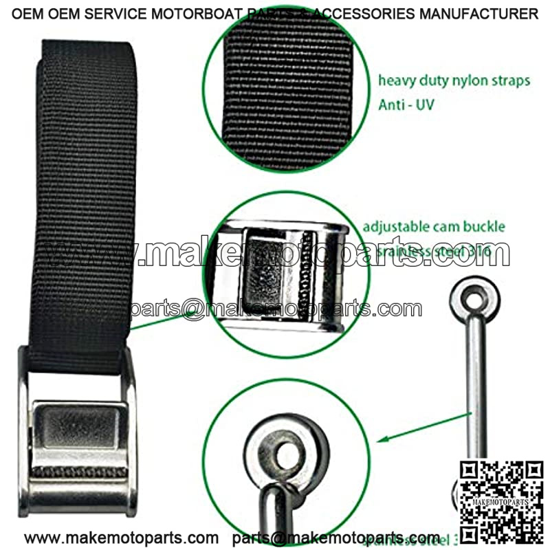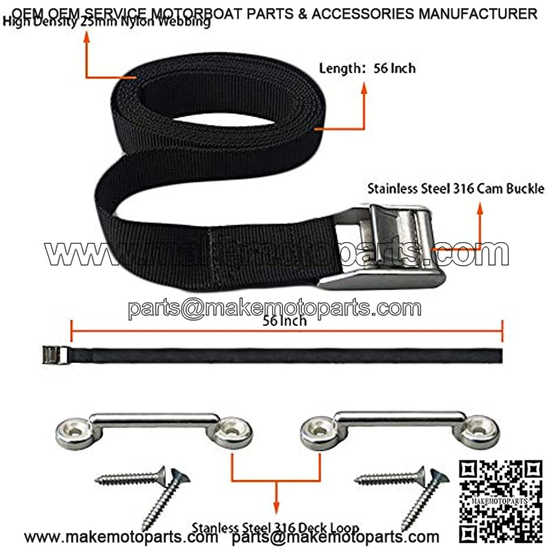 Includes 1pcs 56″nylon webbing, 1 stainless steel 316 buckle , 2 stainless steel 316 eye strap mounts , 4 SS screws .
