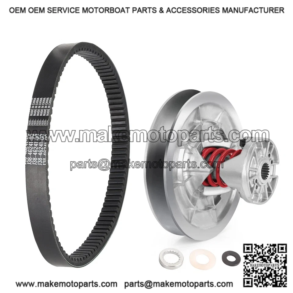 Rear driven clutch kit Includes: Fixed and sliding sheaves, heavy duty spring, spring seat, ramp shoes, woodruff key, spacer, washers and drive belt