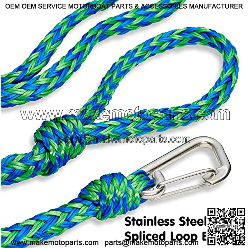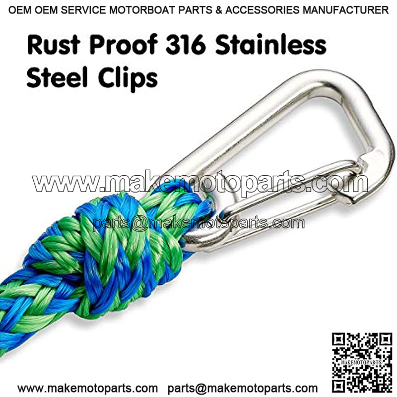 Ropes are 1/2″ or 3/4″ diameter braided polyurethane, rated up to 4000 lbs tensile strengthHigh-visibility colorsOne end is 10″ custom-spliced loop and other end is a rust-proof 316 stainless steel clipSuitable for all personal watercraft and small motorized boatsDesigned for both saltwater and freshwater use
