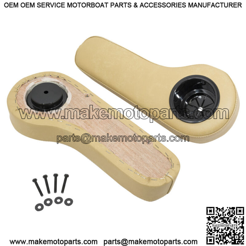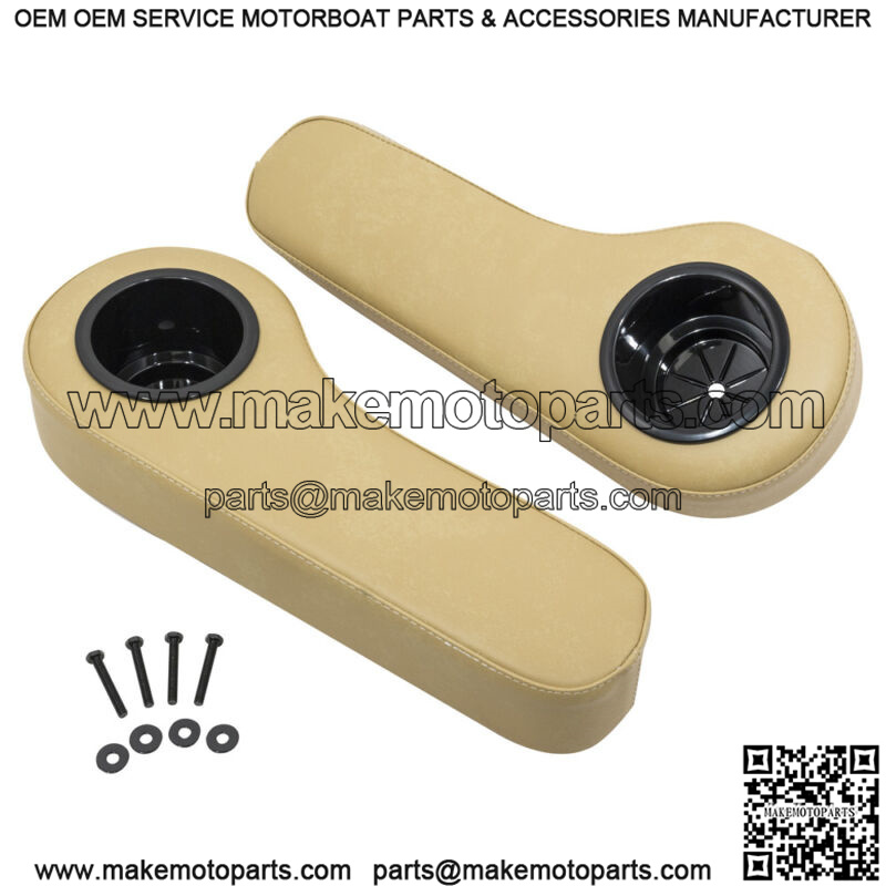 Tan rear seat arm-rest cushions with built in cup holder. Universal fit (set of 2). Includes bolts and drilling templates for easy installation and mounting to any metal rear seat. Installs in 10-15 Minutes.