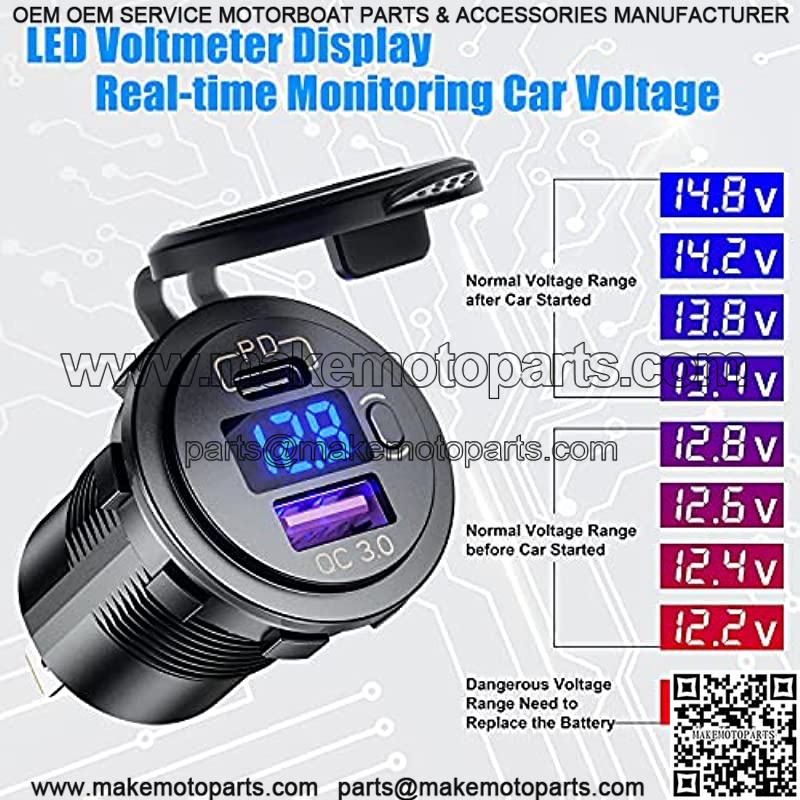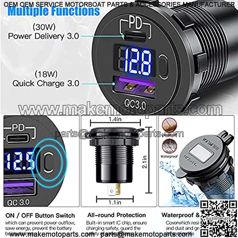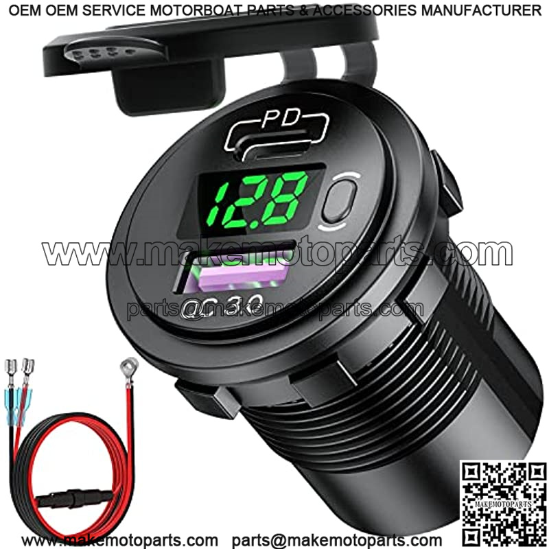 USB C PD 3.0 & Quick Charge 3.0 Dual USB Charger Socket, 12V/24V Waterproof Power Outlet Fast Charge with LED Voltmeter and ON/Off Switch for Car Boat Marine RV ATV Bus Truck Golf Cart