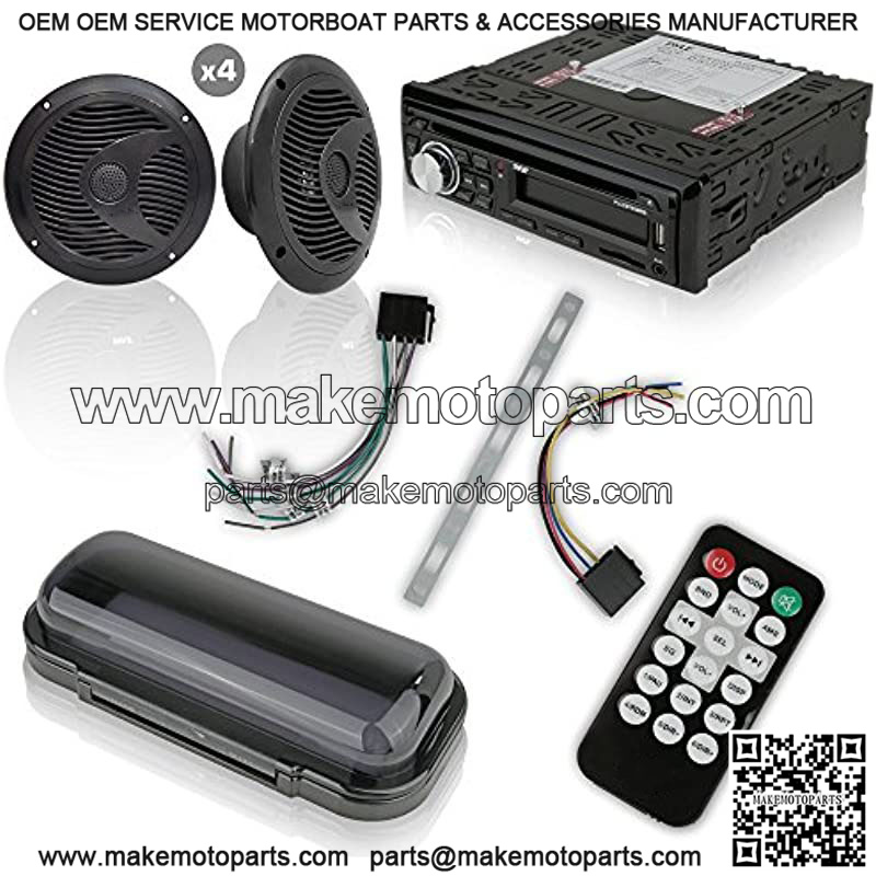 UPDATED FEATURES: This audio stereo kit is unlike others. It comes w/ a Bluetooth marine receiver, 4 pieces 6.5 inches waterproof speakers, a remote control & a radio shield. Has a CD player & slots for MP3/USB/SD reading. It can also use AM/FM radio