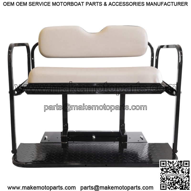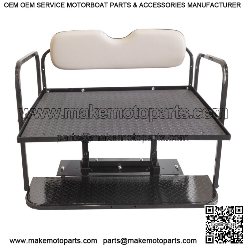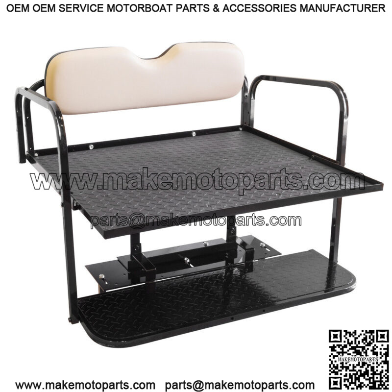 Overview: This seat kit makes a great addition to any golf cart converting your 2 passenger golf cart in to a 4 passenger golf cart. This seat kit includes the Flip Folding capability which allows the bottom seat cushion to flip over and converts the 4 passenger golf cart in to a very strong utility cargo bed featuring our HD Poly Deck for ultimate strength and versatility measuring 42W X 32D. We also include a grab strap to assist when flipping the seat from the closed 4 passenger design over to the cargo bed design. Seat Cushions: All seat cushions are marine grade and are factory matched colors. The back of the seat cushions have a polypropylene backing with pre tapped bolt holes for the seat cushions to mount to. Also with the NO Rot, NO Wood design and the use of polypropylene seat backing you no longer have rotting wood on the backs of the seat in a few years. Installation Details: This items will require 1.5 to 2 hours to complete the installation, however we do include very nice FULL COLOR installation instructions that are clearly labeled. All mounting hardware, bolts, and supports are included, this will make for an easier stress free installation – With this seat kit you will remove your factory basket behind the seat along with all of the brackets that connect the seat to the golf cart. This kit will replace the removed brackets and this kit will include new rear roof supports. – Technical support is always available by phone or email ready to answer any questions. – Estimated Installation Time is 1.5 to 2 Hours